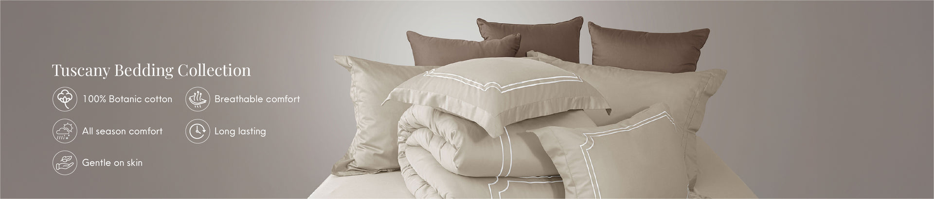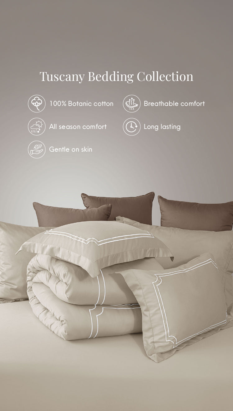Elevate your retreat to a masterpiece with the Tuscany Bedding Collection. Inspired by the serene aesthetics of high-end boutique suites, this line features exquisite embroidery and 100% Botanic Cotton to invite you into a world where modern simplicity meets unparalleled comfort.